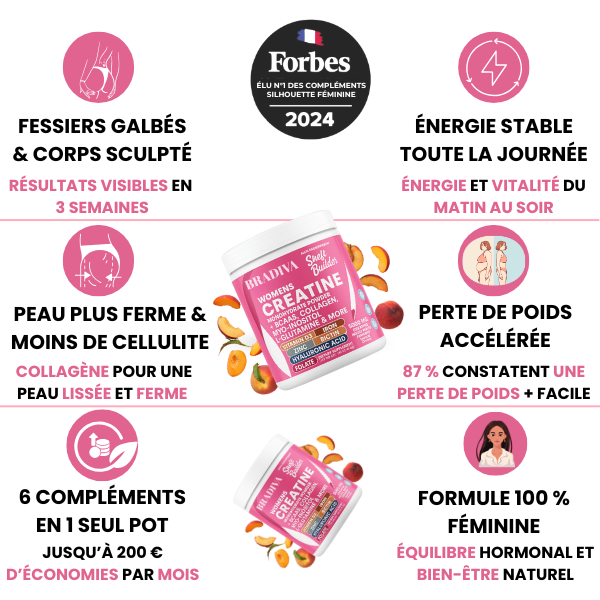 Bradiva remplace la plupart des compléments : créatine, BCAA, collagène, glutamine et vitamines essentielles.